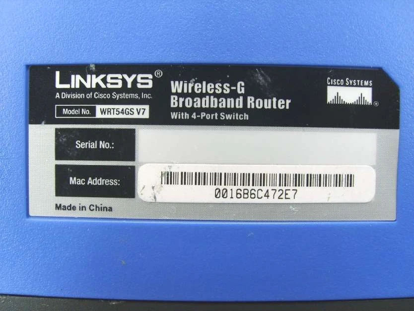 Serial Num. = CGNC FCC ID = Q87-WRT54GSV7 CPU Type = Broadcom BCM5354 chip rev 2 MIPS Rev = ? CPU Speed = 240MHz Bus = ? Flash Type = Parallel Flash Chip = i J526F160 C38D70 A7137295 Flash Size = 2MB Max Firmware Size = 1769472 bytes RAM Size = 16MB RAM Chip = MIRA P2V28540CTP nvram Size = 32kb Switch = Broadcom BCM5354K (SoC) Port-based vlan = Yes 802.1q vlan = ? Ethernet Port Count = 1-10/100-WAN 4-10/100-LAN Wired Standard = IEEE 802.3/3u boot_wait = ? bootloader = CFE Flash Card Socket/Type = No SD/MMC Mod Support = No MiniPCI slots = No PoE = No Power = 12V/.5A Color of LEDs = ? Size = ? USB = No Serial Port = Yes JTAG Port = Yes Supported by TJTAG 3.02 = Yes Supported by dd-wrt as of = ? dd-wrt K2.4 Support = Yes dd-wrt K2.6 Support = No Special Features = ?