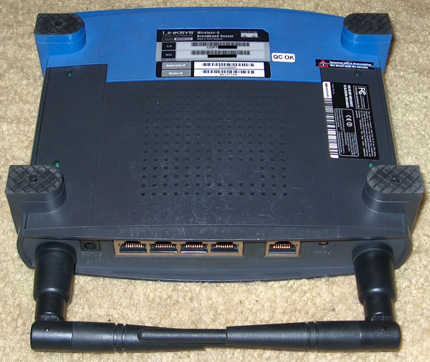 Serial Num. = CDF7 FCC ID = Q87-WT54GV22 CPU Type = Broadcom BCM4712LKFB (BCM4712 chip rev 1) MIPS Rev = ? CPU Speed = 216MHz Bus = ? Flash Type = Parallel Flash Chip = Intel TE28F320 C3B070 A4407332 (Intel 28F320C3) Flash Size = 4MB Max Firmware Size = 3801088 bytes RAM Size = 16MB RAM Chip = hynix 431A HY5DU281622ET-J nvram Size = 32kb Switch = Broadcom BCM5325EKQM Port-based vlan = Yes - Via GUI & nvram 802.1q vlan = ? Ethernet Port Count = 1-10/100-WAN 4-10/100-LAN Wired Standard = IEEE 802.3/3u boot_wait = ? bootloader = CFE Flash Card Socket/Type = No SD/MMC Mod Support = ? MiniPCI slots = No PoE = No Power = 12V/1A Color of LEDs = ? Size = 7.32" x 1.89" x 6.06" USB = No Serial Port = 2x JTAG Port = Yes Supported by TJTAG/Version = Yes/3.02 Supported by dd-wrt as of = ? dd-wrt K2.4 Support = Yes dd-wrt K2.6 Support = No Special Features = ?